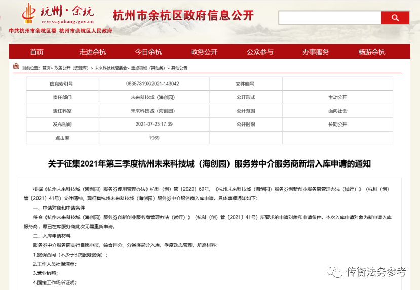 7月23日杭州未来科技城根据《杭州未来科技城(海创园)服务券使用管理办法》杭科(创)管〔2020〕69号、《杭州未来科技城(海创园)服务券创新创业服务商管理办法(试行)》(杭科(创)管〔2021〕41号)文件精神,开始征集杭州未来科技城(海创园)服务券中介服务商入库申请。