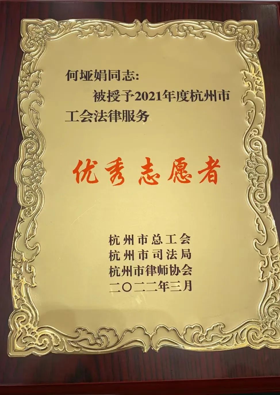 会上表彰了2021年度杭州市工会法律服务优秀志愿者。传衡所主任何垭娟律师获得“2021年度杭州市工会法律服务优秀志愿者”荣誉称号。