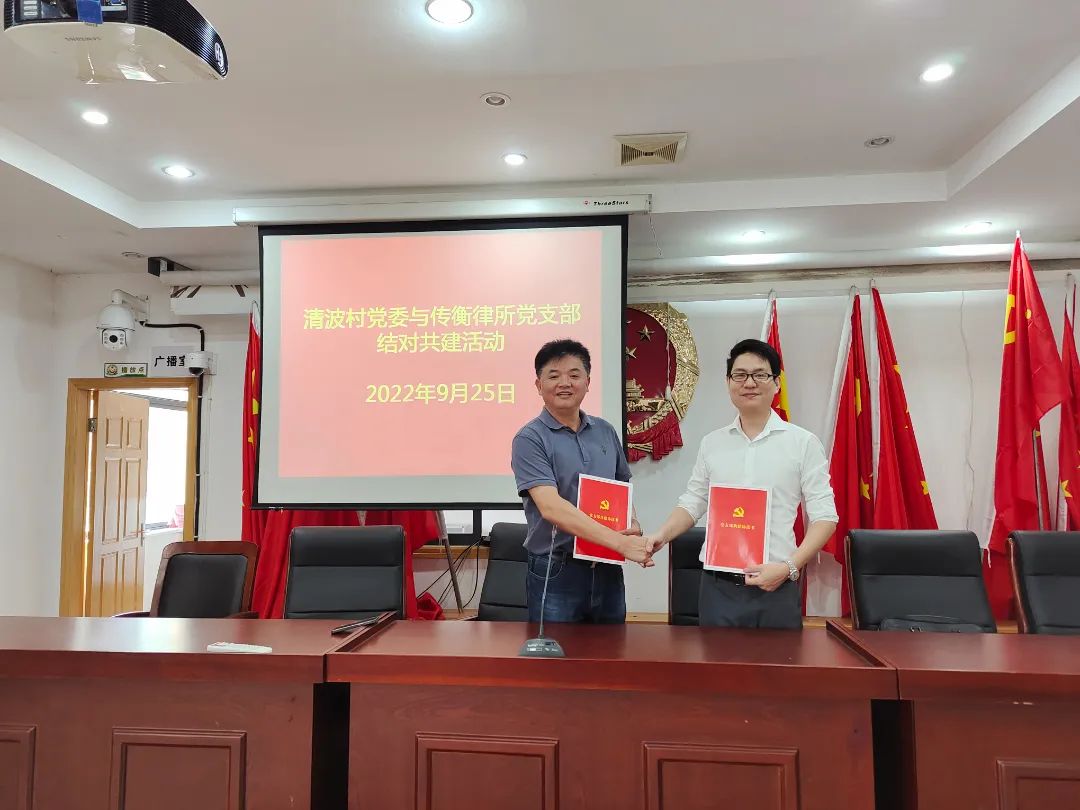 2022年9月25日上午,中共浙江传衡律师事务所党支部与中共杭州市余杭区黄湖镇清波村党支部,举行了党建结对签约仪式,清波村党支部书记徐秋水与传衡所党支部书记葛伟刚签署了合作协议,喜迎中共二十大的胜利召开。