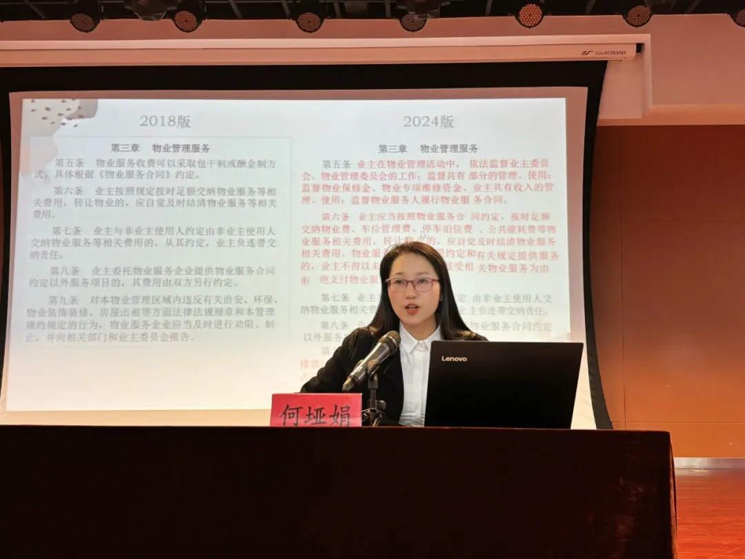 为推动辖区内物业管理水平整体提升,提高新上岗业主委员会(物业管理委员会)履职能力,杭州市拱墅区住建局于2024年10月30日组织开展了拱墅区业主委员会(物业管理委员会)专题培训会,传衡所主任何垭娟律师受邀到场授课。