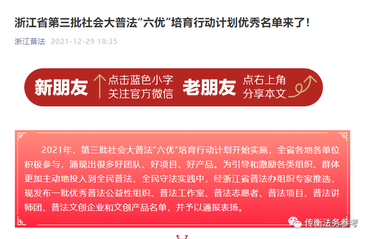 近日,省普法办发文表彰全省第三批社会化大普法“六优”培育行动计划优秀名单, 浙江传衡律师事务所主任、壹企惠普法公益服务中心理事何垭娟成功入围优秀普法志愿者。