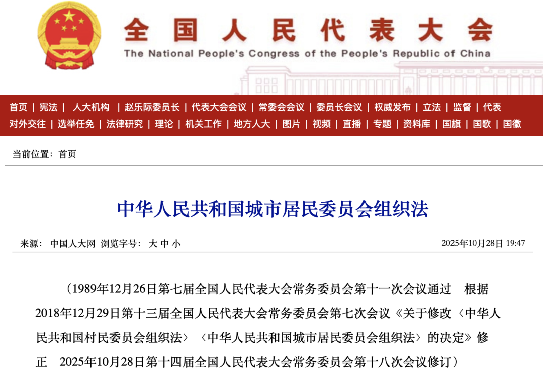 (1989年12月26日第七届全国人民代表大会常务委员会第十一次会议通过 根据2018年12月29日第十三届全国人民代表大会常务委员会第七次会议《关于修改〈中华人民共和国村民委员会组织法〉〈中华人民共和国城市居民委员会组织法〉的决定》修正 2025年10月28日第十四届全国人民代表大会常务委员会第十八次会议修订)