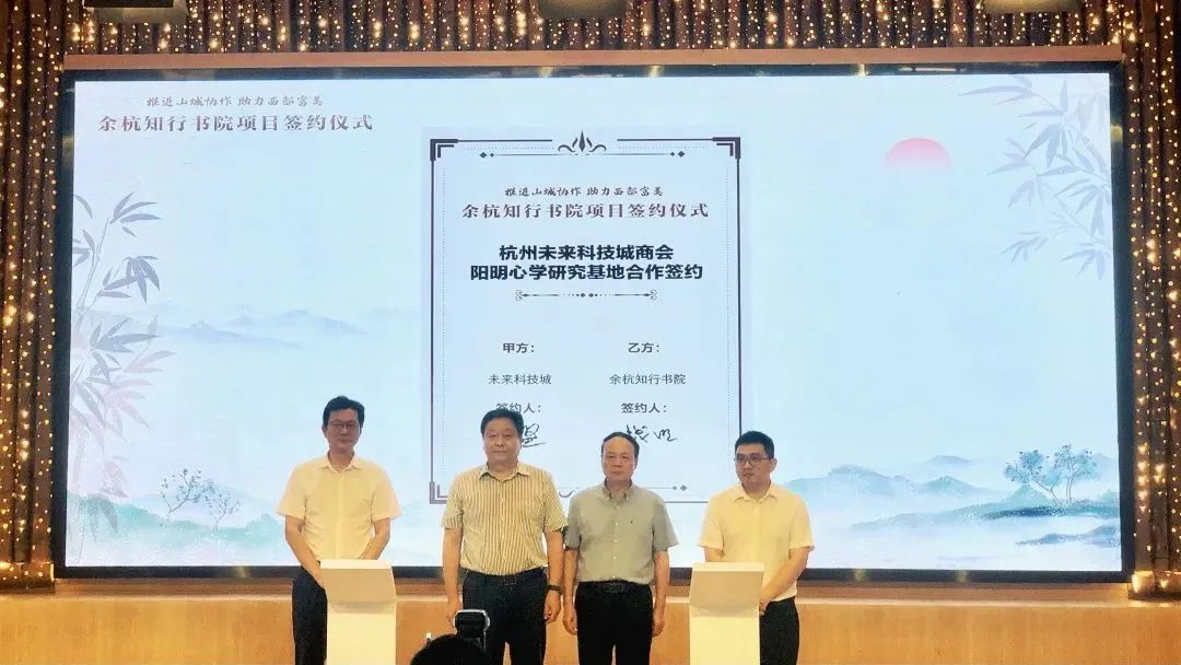 活动现场,未来科技城商会与余杭知行书院阳明心学研究基地进行项目合作签约。